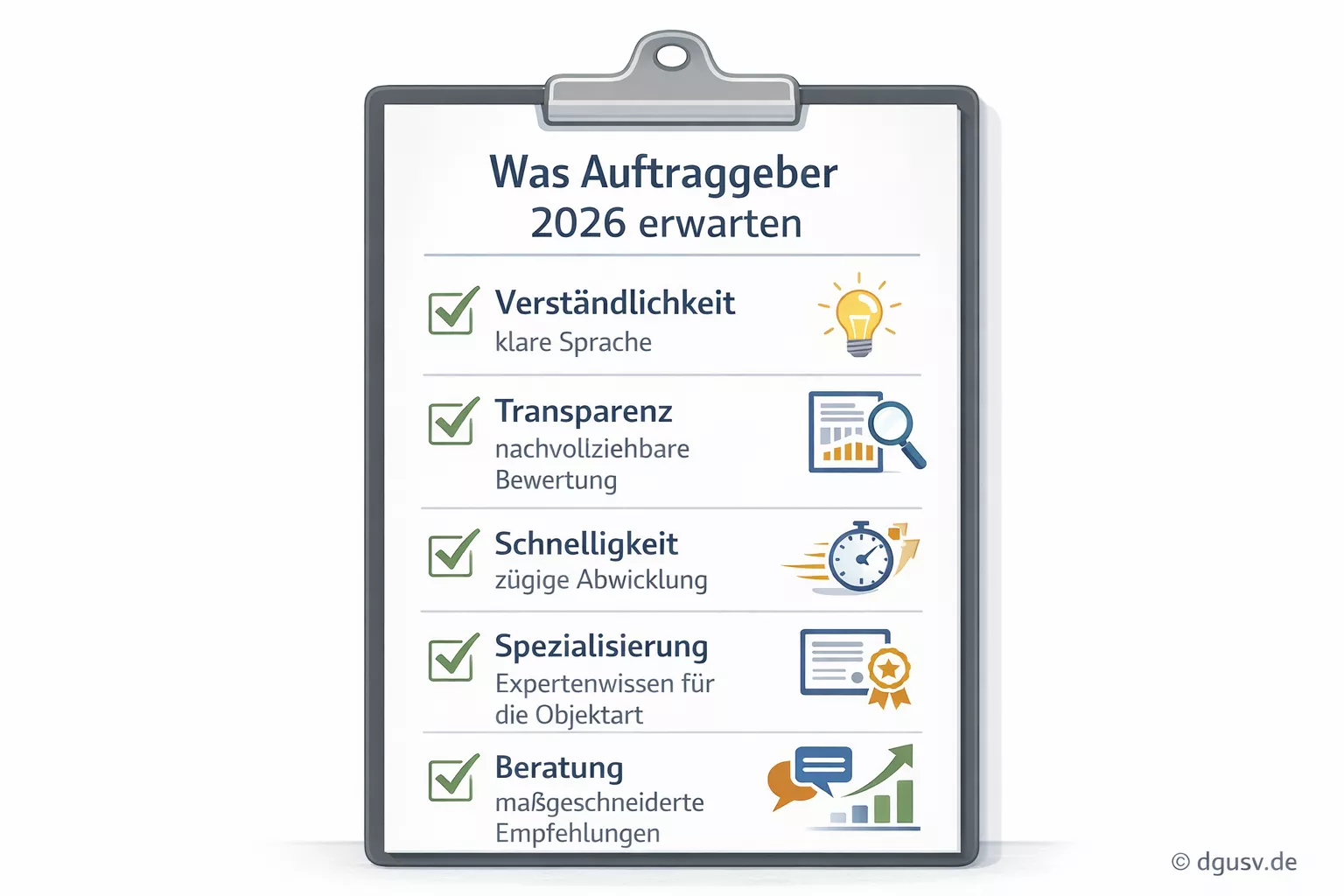 Neben einer fundierten Wertermittlung legen Auftraggeber großen Wert auf Transparenz, Verständlichkeit und konkrete Handlungsempfehlungen. Die Beratungsfunktion gewinnt zunehmend an Bedeutung.